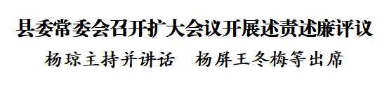 2月26日,县委常委会召开扩大会议,听取各乡镇和县直部门单位“一把手”述责述廉。县委书记杨琼主持会议并讲话,县委副书记、县长杨屏,县政协主席王冬梅,县委副书记杨再勇、赵辽,县委常委等县领导出席会议。