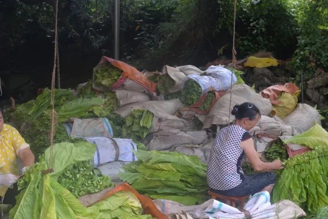 在村民家的院子里,刚采收的鲜烟叶堆得像小山一般。几位村民围坐一旁,正全神贯注地忙碌着,他们手法麻利,将一片片烟叶熟练地“编”上烟竿。